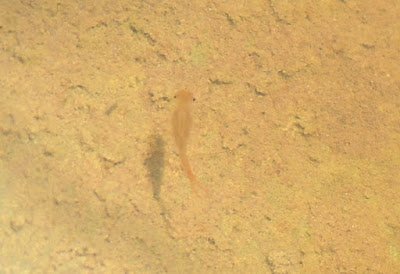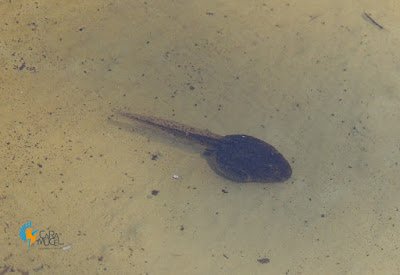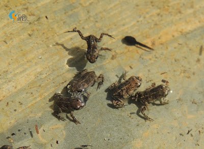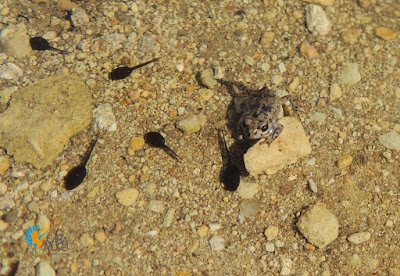 | Pequeño sapo corredor (Epidalea calamita), recien finalizada la metamorfosis, junto a varias larvas de la misma especie, correspondientes a una de las últimas puestas realizadas en este punto de agua. |