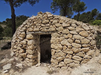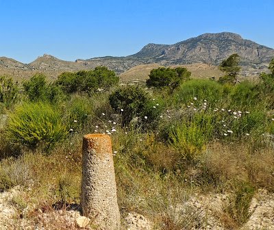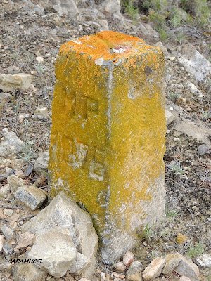 | Mojón de vía pecuaria en el enlace de los Cordeles de los Valencianos y de las Pocicas y Cueva de la Excomunión. |